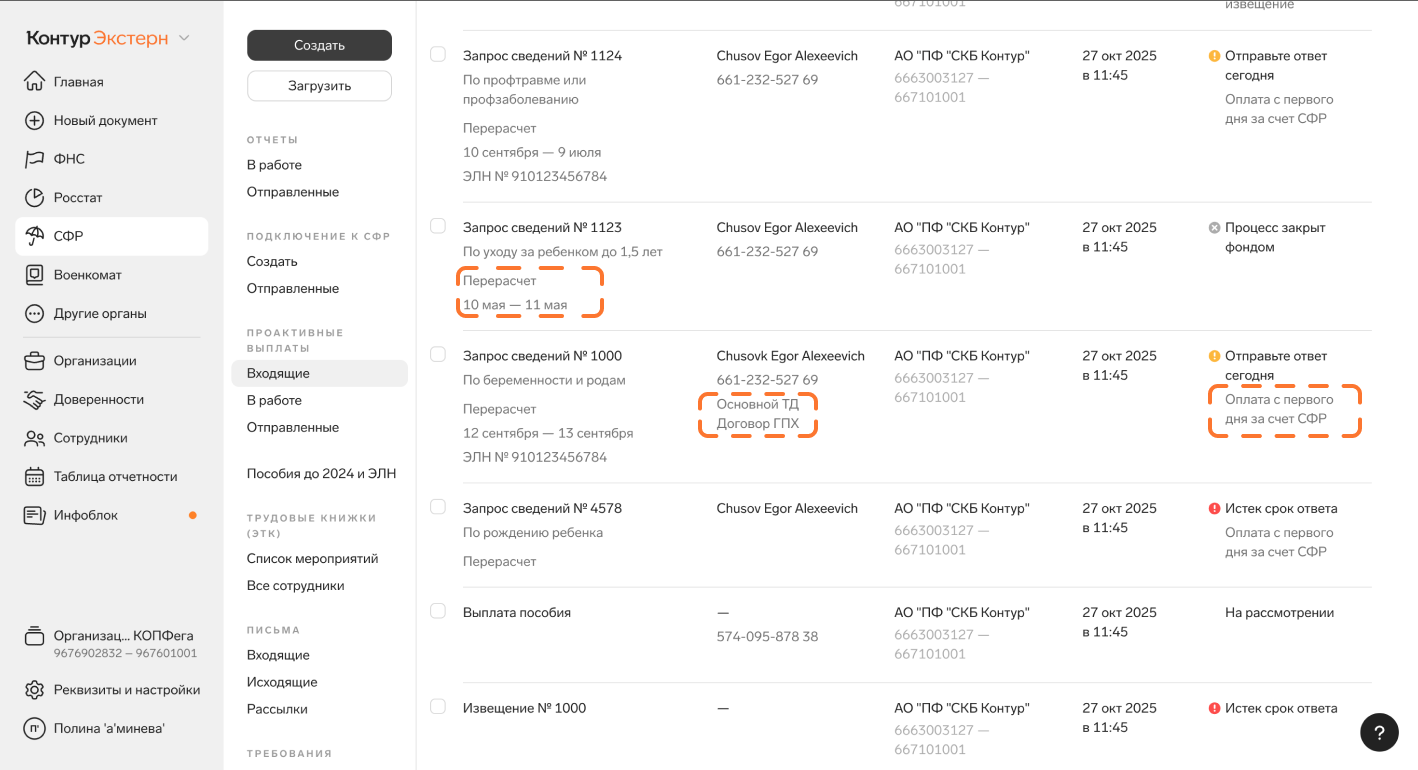 В разделе «Проактивные выплаты» появились новые фильтры и дополнительные реквизиты в списке входящих документов. Благодаря этому можно быстрее находить нужные сведения, анализировать статусы выплат и видеть, по каким договорам и периодам нетрудоспособности поступили сообщения от СФР.